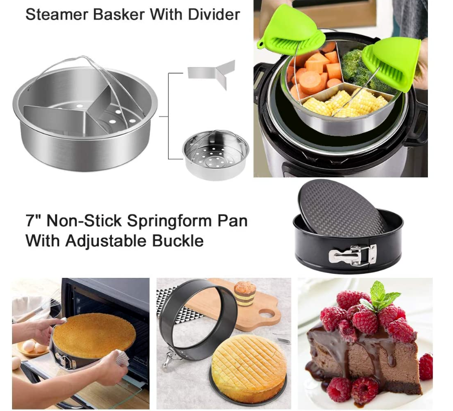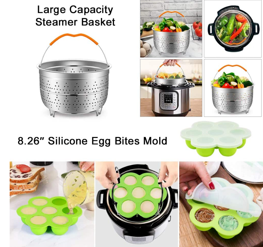 • ★[Multifunction Complete Accessories for Instant Pot] Make delicious eggs, chicken broth, vegetables, asparagus, meat with 2 steamer baskets, bake cake and lasagna in cheesecake pan & silicone baking cups, cook 14 eggs at once with egg rack, make sous vide egg bites with egg bites mold, consume 80% less fat with parchment papers, magnetic cheat sheets,recipe book about accessories instructions, steam rack trivet with long handles for easy pot removal, protect household surfaces with silicone mat
