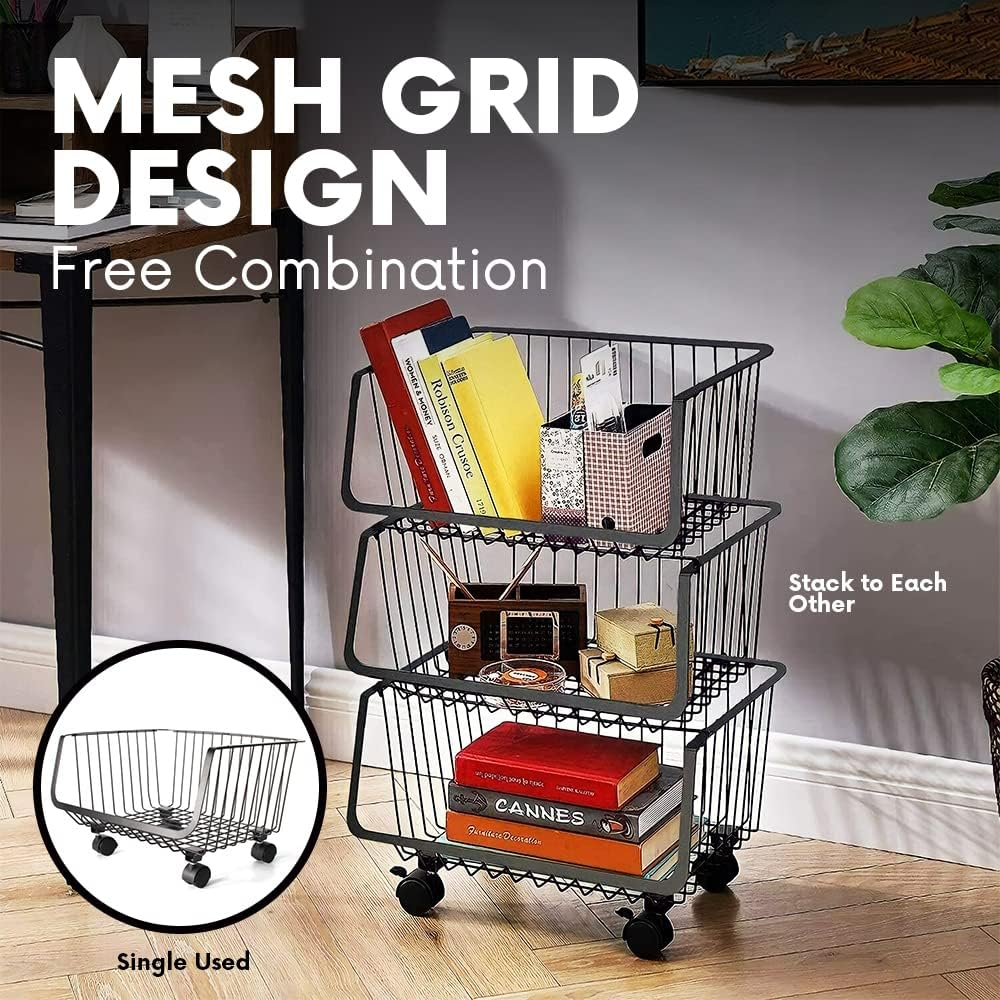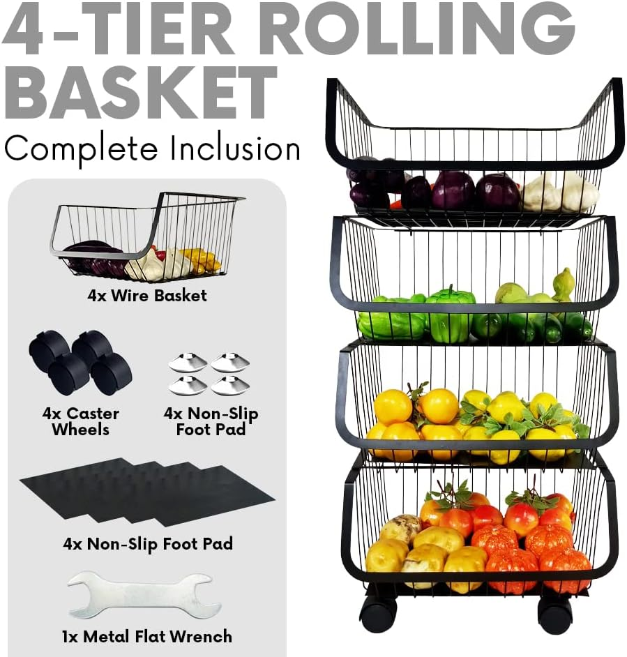 4-Tier Utility Rolling Cart - Metal Black Basket, Storage Organizer for Pantry,