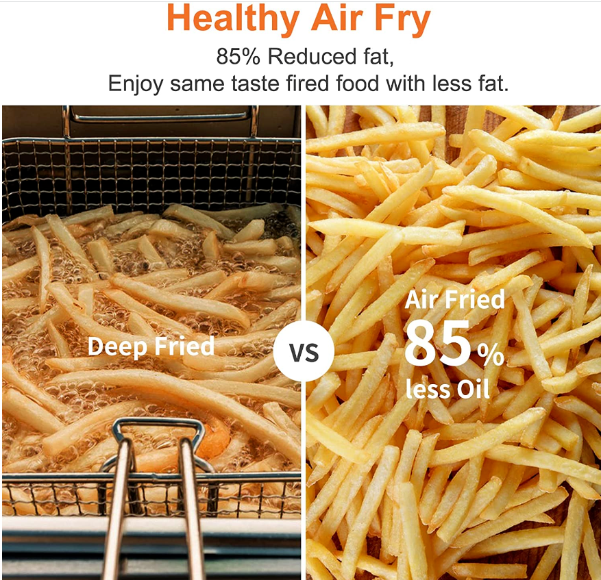 • ?360° RAPID HEAT CIRCULATION AIR FRY TECHNOLOGY: Compared to the traditional oven, our air fryer toaster oven adopts 360° rapid heat circulation Air Fry Technology, which requires up to 85% less oil than traditional deep frying while maintaining the same crispy textures, making it ideal for air frying chicken, French fries, steak, fish and more.