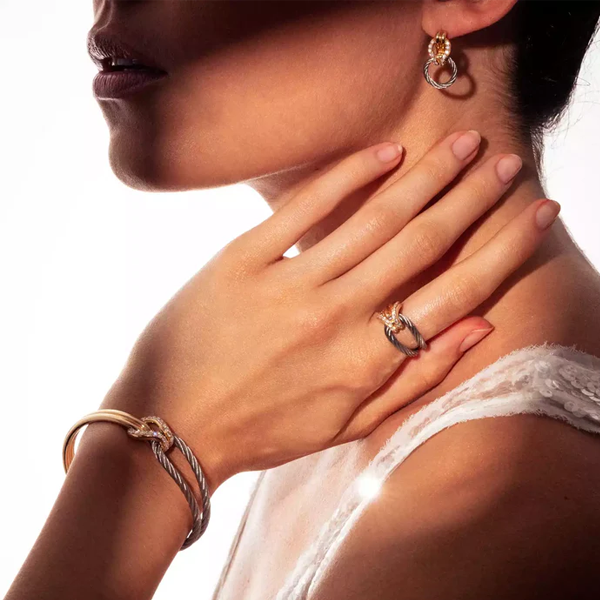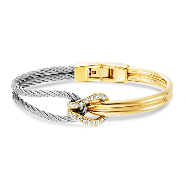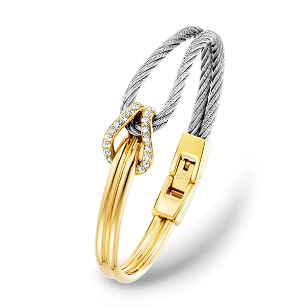 CELTIC KNOT Bangle, 18K gold Décor, 0.73ct CVD diamonds (GH/VS), 1 row stainless steel cable, 2.5mm cable A recurring motif found in the dimensional decoration of Celtic style is the endless knot, a deft design wherein a simple pattern interlaces back on itself - a nod to the notion of an endless continuum. As such, our Celtic® Knot line enacts a symbol of eternity and an emblem of fidelity as two parallel lines fold over a loop of iconic twisted cable to form a pleasing configuration that is at once refined and resolute. Such an agreeable impression of satisfying design extends to the ring and earring sets, pieces that are compact, enduring and lovely - the trifecta of daily wear.
